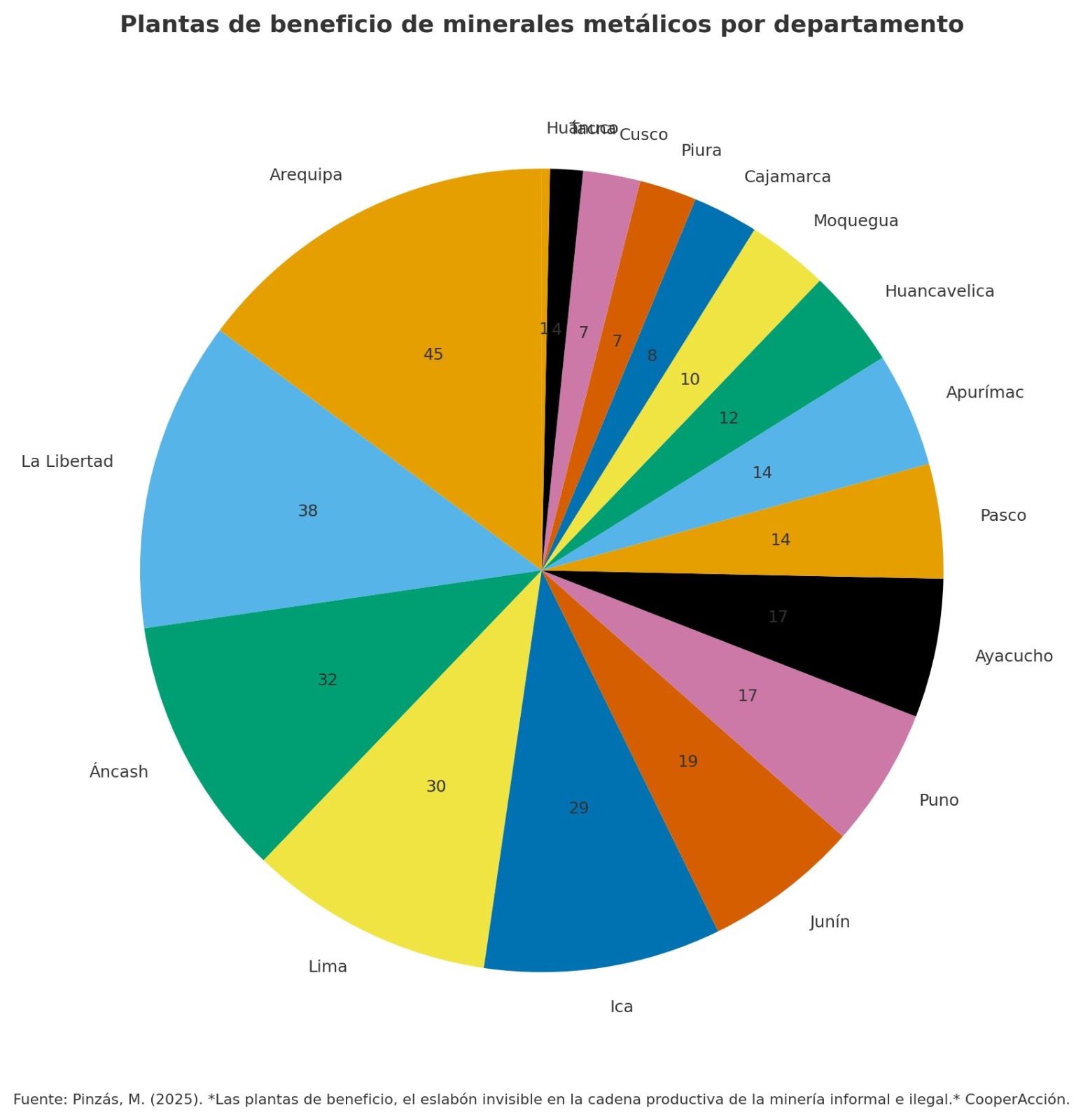 Hablamos de 357 plantas a nivel nacional: 53 procesan material no metálico y 304, metálico. Estas últimas operan en diecisiete de veinticuatro departamentos, más de la mitad instaladas entre Arequipa, La Libertad, Áncash, Lima e Ica. Según el trabajo de Pinzás, son plantas de beneficio de mineras formales, informales e ilegales. No se cuenta con información para diferenciar unas de otras. Ese trabajo se titula «Las plantas de beneficio, el eslabón invisible en la cadena productiva de la minería informal e ilegal».