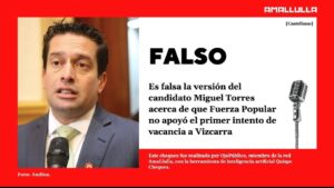 En función de lo expuesto, AmaLlulla concluye que es falsa la versión de Miguel Torres, candidato a la segunda vicepresidencia y al Senado por Fuerza Popular, acerca de que este partido político no apoyó el primer intento de vacancia contra Martín Vizcarra.