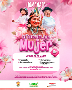 El distrito de Kimbiri desarrollará importantes actividades públicas por la conmemoración oficial del Día Internacional de la Mujer durante la presente semana. La Gerencia de Desarrollo Social de la Municipalidad Distrital de Kimbiri informó que la jornada central se realizará este viernes seis de marzo. Las mujeres líderes de Kimbiri iniciarán su programa de festejos desde las ocho de la mañana con un colorido pasacalle por las calles. La Instancia Distrital de Concertación organiza este evento masivo para resaltar el papel fundamental que desempeñan las ciudadanas en el desarrollo local. El punto de encuentro principal para todas las asistentes será el frontis de la municipalidad para dar inicio a la gran caminata.