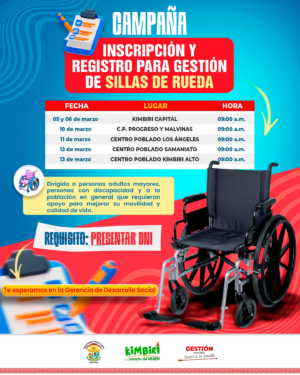 La Municipalidad Distrital de Kimbiri anunció el inicio de una campaña masiva de inscripción para la gestión de sillas de ruedas en Kimbiri este mes. Esta iniciativa busca beneficiar directamente a los adultos mayores y a las personas con discapacidad que requieran apoyo para mejorar su movilidad diaria. El registro oficial se realizará a través de la oficina del Centro Integral de Atención al Adulto Mayor y la oficina de Omaped local. Las autoridades municipales impulsan estas acciones orientadas a fortalecer la inclusión social de los sectores más necesitados dentro de toda la jurisdicción distrital. El objetivo principal de la campaña consiste en elevar la calidad de vida de los ciudadanos mediante la entrega de implementos biomecánicos especializados.