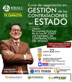 La jornada formativa contará con la participación especial del presidente de la Mancomunidad, el señor Guido Figueroa Ramos, durante la apertura. De igual modo, el equipo técnico de la institución participará activamente en el desarrollo de los temas clave sobre la normativa estatal vigente ahora. Según detallaron los organizadores, el curso se llevará a cabo desde las cuatro de la tarde en el auditorio institucional ubicado localmente. No obstante, los interesados también podrán seguir el evento de manera virtual para facilitar la participación masiva de todos los distritos amazónicos.