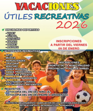 La Municipalidad Provincial de La Convención anunció oficialmente el inicio de las inscripciones para el esperado programa municipal Vacaciones Útiles Recreativas 2026. Ciertamente, el programa de Vacaciones Útiles en La Convención busca beneficiar a todos los niños y niñas desde los seis años de edad. Los padres de familia deben acudir personalmente al frontis del edificio municipal ubicado exactamente en la Plaza de Armas de la ciudad. El horario de atención para registrar a los menores comenzará puntualmente a las nueve de la mañana y terminará a la una tarde. Este importante proceso de inscripción estará disponible para toda la comunidad convenciana a partir de este mismo viernes nueve de enero del 2026. Por consiguiente, la oferta educativa incluye emocionantes disciplinas deportivas como el fútbol, el vóley, la natación, el básquet, el karate y también ajedrez. La comuna provincial también ofrece variadas actividades recreativas como arte, música, manualidades, oratoria, minichef, danza moderna, danza tradicional y además clases de modelaje. Asimismo, los talleres académicos de razonamiento verbal y razonamiento matemático reforzarán significativamente el aprendizaje escolar de los alumnos durante este periodo vacacional. Efectivamente, los padres o apoderados responsables deben presentar obligatoriamente una fotocopia del DNI del menor y también una copia del DNI adulto.