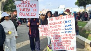 Los manifestantes expresaron su rechazo a José Jerí con pancartas y gritos que exigían su salida del cargo. Entre los mensajes se leía “Fuera del Palacio” y “Sacan a una asesina y ponen a un violador”, en referencia a las denuncias que enfrenta el presidente. Los arengas exigían su salida inmediata del cargo y cuestionaban la legitimidad de su gobierno.