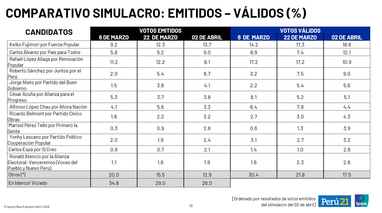 De acuerdo con el simulacro de votación de DATUM presentado este domingo 5 de abril, Keiko Fujimori lidera con 18,1% de votos válidos. Luego hay un empate técnico entre Carlos Álvarez (10,8%) y Rafael López Aliaga (10,3), en el segundo lugar. Y según el simulacro de IPSOS de este sábado 4 de abril Fujimori obtiene un 18,6%, seguida igualmente por Álvarez (12,1%) y López Aliaga (10,9%).