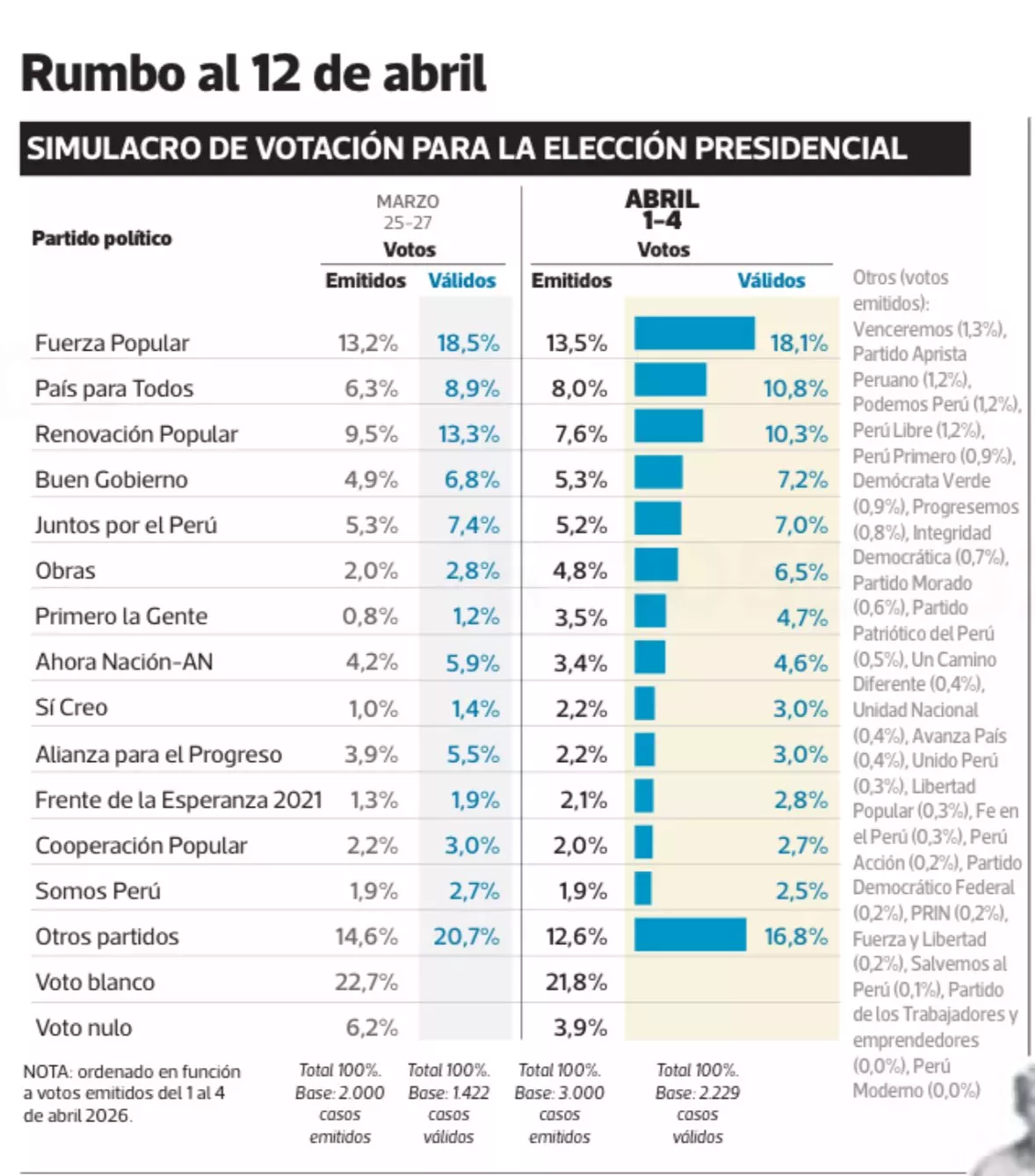 De acuerdo con el simulacro de votación de DATUM presentado este domingo 5 de abril, Keiko Fujimori lidera con 18,1% de votos válidos. Luego hay un empate técnico entre Carlos Álvarez (10,8%) y Rafael López Aliaga (10,3), en el segundo lugar. Y según el simulacro de IPSOS de este sábado 4 de abril Fujimori obtiene un 18,6%, seguida igualmente por Álvarez (12,1%) y López Aliaga (10,9%).